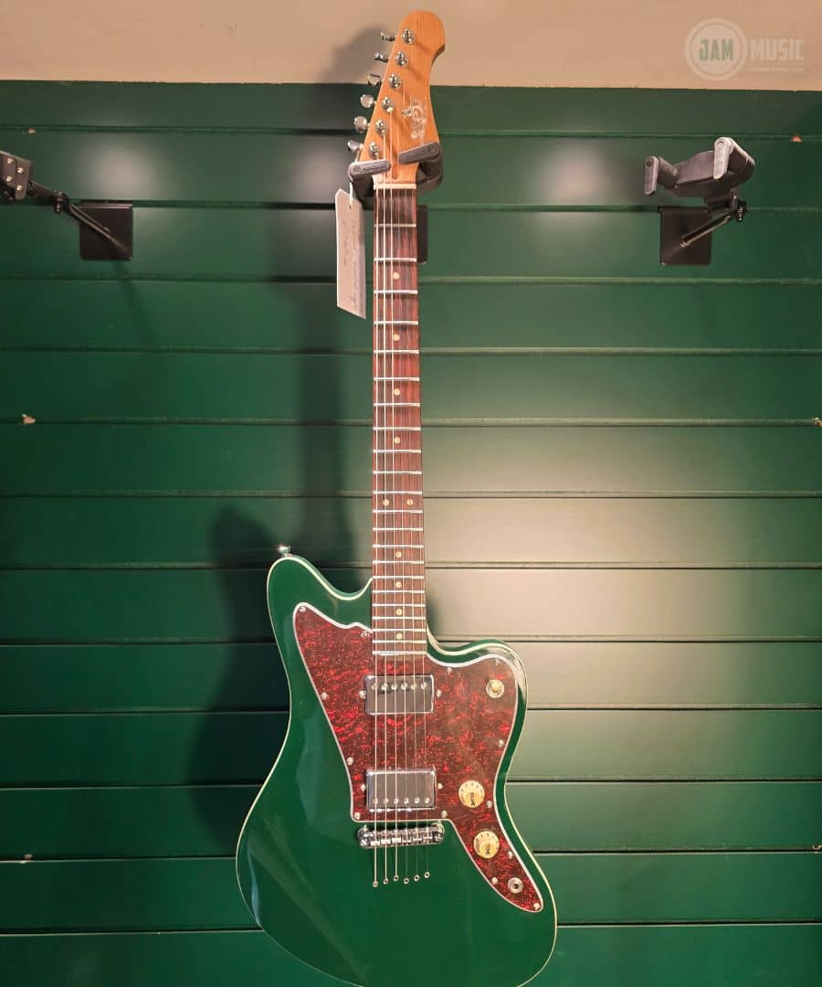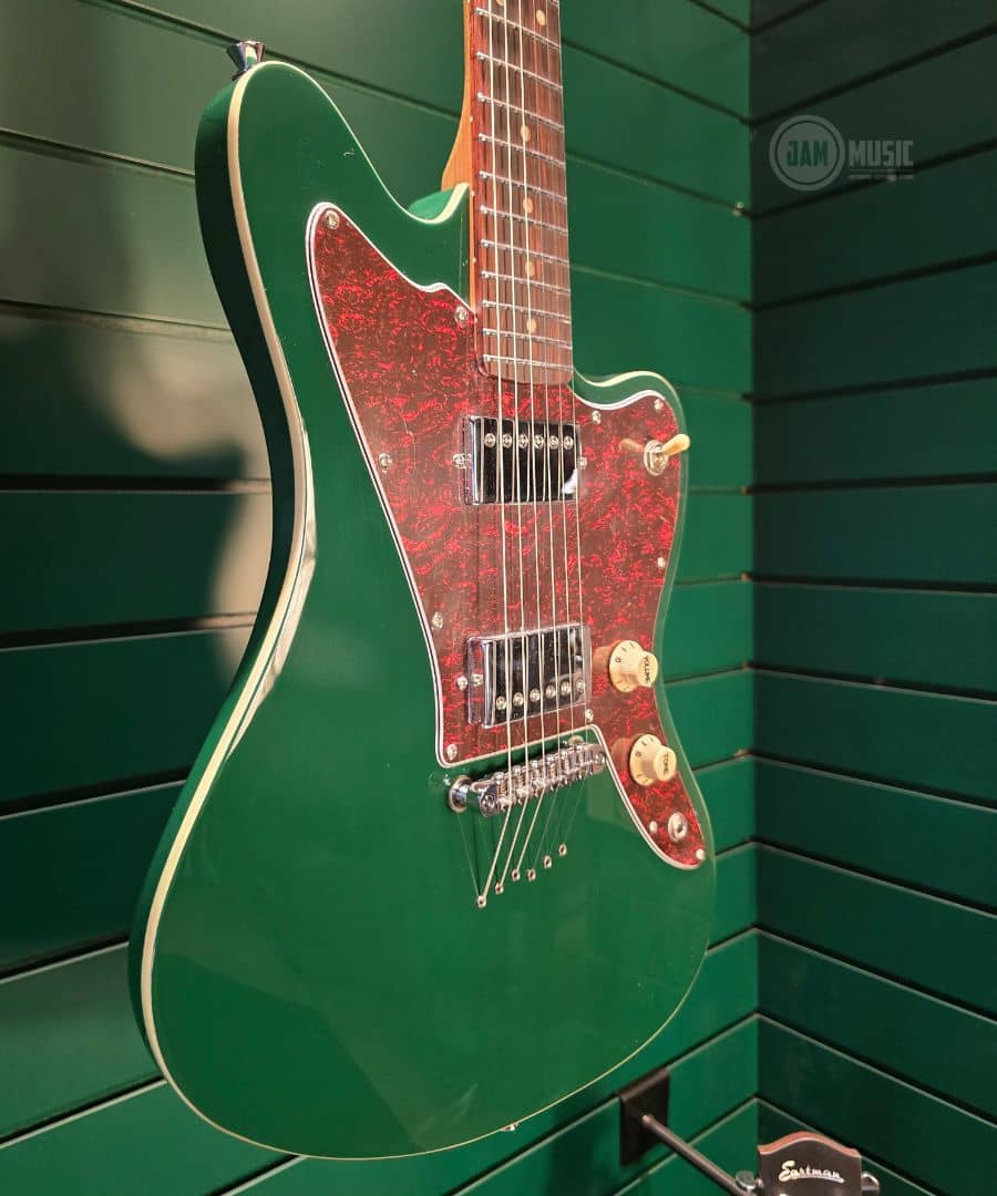 The Jet JJ-350 GR R blends offset style with modern performance in a striking green finish. Its lightweight basswood body and roasted maple neck deliver a resonant and responsive playing experience, while dual HH ceramic humbuckers give you punchy, high-output tone for rock, metal, and anything in between. With a simple control layout, fixed string-through bridge, and chrome hardware, this guitar offers durability and clarity in a bold package that stands out on stage.