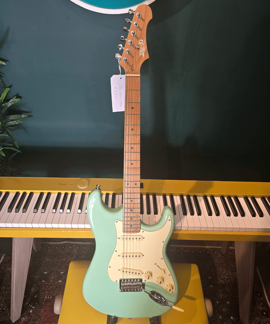 The Jet JS-300 in Sea Foam Green brings vintage charm and modern playability together in one striking package. Its lightweight basswood body and roasted maple neck make it easy to handle while delivering a full, vibrant tone. With three ceramic single-coil pickups and a 5-way selector, you’ve got a wide tonal palette from shimmering cleans to biting blues and rock sounds. The gloss sea foam green finish looks stunning under the lights, and the chrome hardware adds classic style and reliability. For players seeking a color-forward Strat-style with solid performance, this is an excellent choice.