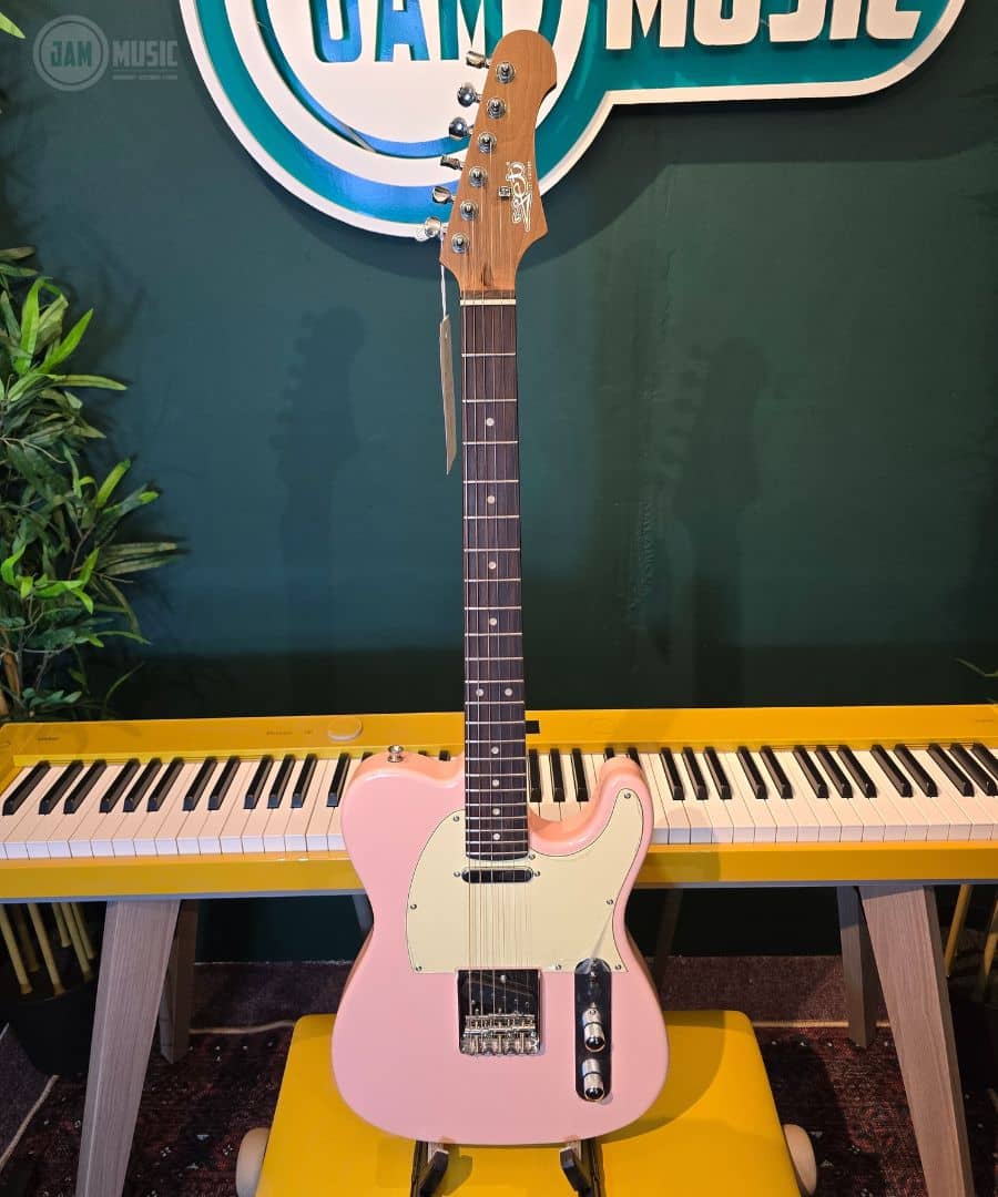 The Jet JT-300 in Shell Pink puts a fresh twist on the classic Tele-style design. With a lightweight basswood body and a smooth roasted maple neck, it delivers comfortable playability and a balanced tone. The dual ceramic single-coil pickups offer bright cleans, twangy rhythm tones, and plenty of bite when pushed. Finished in a standout gloss Shell Pink with chrome hardware, this model is perfect for players who want vintage style with modern build quality at an accessible price.