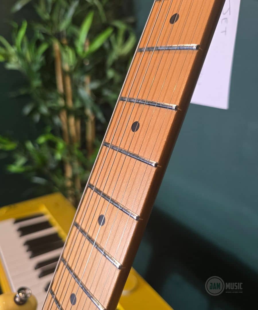 The Jet JS-400 Vintage Yellow combines bold looks with flexible tone. Its HSS pickup configuration delivers everything from glassy single-coil cleans to powerful humbucker drive, making it a versatile choice for players across genres. A roasted maple neck, 2-point tremolo, and chrome hardware round out this feature-packed guitar—perfect for players wanting Strat-style versatility with standout stage presence.